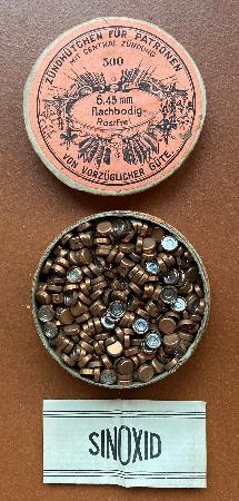 6.45mm, flachbodig und rostfrei, von vorzüglicher Güte; Metall: Messing; Zündsatz: Sinoxid, bestimmt für rauchloses Pulver; Bermerkung: verkupfert