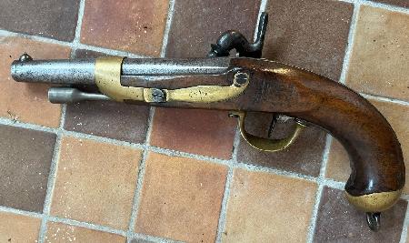 Pistolet de collection - Pistolet de cavalerie ou d'arçon à percussion St. Etienne - modèle 1822 Tbis Il s'agit d'un pistolet de cavalerie des armes impériales françaises, modèle 1822 Tbis, obtenu par l'amélioration du modèle XIII français, fabriqué à Saint Étienne en 1822 et modifié à Tulle en 1861 (marquage derrière la platine) de silex à percussion, avec baguette. Preisvorschläge möglich. Auf Wunsch können per E-Mail weitere Bilder gesendet werden. Abholung in Orselina nach Vorauszahlung und Absprache möglich. Privatverkauf: keine Garantie und keine Rücknahme. Kein Verkauf ins Ausland. Twint auf Anfrage möglich. Zuzüglich Versandkosten: (Einschreiben: CHF 13.00)