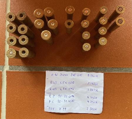 Sammelsurium Messinghülsen Hülsen gebraucht: - W-W Super 348 WIN: 8 Stück - RWS 6,5x68R: 5 Stück - RWS 6,5x57R: 2 Stück - R-P 30-30 WIN: 4 Stück - F C 30-30 WIN: 4 Stück - POF 7-99: 2 Stück Total: 25 Hülsen Privatverkauf: keine Garantie und keine Rücknahme. Twint auf Anfrage möglich. Zuzüglich Versandkosten: CHF 9.00