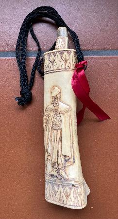 Pulverflasche aus Ungarn Pulverflasche gefertigt aus einem Rinder-Röhrenbein mit einer figürlichen Darstellung eines ungarischen Hirten aus der Puszta (Hortobagy Nemzeti Park = Nationalpark Ungarns) und eines Wappens auf der Rückseite. Verschliessbare Pulverschütte (ohne Stöpsel). Kleiner Defekt am unteren Rand der Pulverflasche. Gesamthöhe: ca. 24cm Feine handwerkliche Arbeit. Gewicht: ca. 400g Privatverkauf: keine Garantie und keine Rücknahme. Twint auf Anfrage möglich. Zuzüglich Versandkosten: CHF 9.00