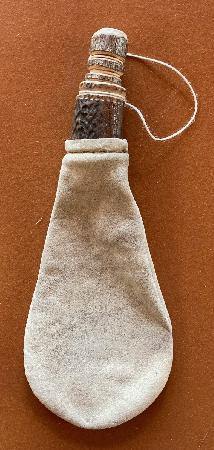 Schrotbeutel/Pulverbeutel Handgefertigter Pulverbeutel für Schrot/ev. für kleine Rundgeschosse aus hellem Wildleder; Abschluss/Ausguss aus Horn, gebräunt, Verschlusspfropfen aus Holz. Passend auch als Accessoire für mittelalterliches Fest. Poire à plomb en peau retournée souple, cousue et sans décor avec bec verseur et bouchon. This nicely made shot pouche is for round ball or loose shot and has spout of horn. Gesamtlänge: ca. 23cm Beutellänge: 17cm; Beutelbreite: 9cm Privatverkauf: keine Garantie und keine Rücknahme. Twint auf Anfrage möglich. Zuzüglich Versandkosten: CHF 9.00