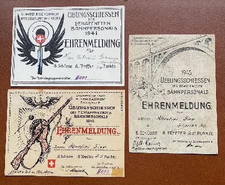 Übungsschiessen des bewaffneten Bahnpersonals (3 Sammlerkarten) Originale Ehrenmeldungen. Seltene Sammlerstücke mit historischem Wert! Die Karten weisen leichte Gebrauchsspuren auf. Ideal für Sammler von Militaria, Schützenvereine oder Geschichtsinteressierte. - 3 Ehrenmeldungen von 1941, 1941, 1945 Privatverkauf: keine Garantie und keine Rücknahme. Twint auf Anfrage möglich Zuzüglich Versandkosten: CHF 2.50