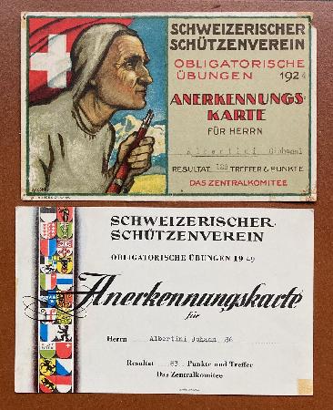 Schweizerischer Schützenverein (2 Sammlerkarten) Originale Anerkennungskarten. Seltene Sammlerstücke mit historischem Wert! Die Karten weisen leichte Gebrauchsspuren auf. Ideal für Sammler von Militaria, Schützenvereine oder Geschichtsinteressierte. - Obligatorische Übungen 1924, Anerkennungskarte  - Obligatorische Übungen 1949, Anerkennungskarte Privatverkauf: keine Garantie und keine Rücknahme. Twint auf Anfrage möglich. Zuzüglich Versandkosten: CHF 2.50