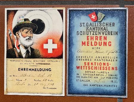 Sankt Gallen (2 Sammlerkarten) 2 originale Sammlerkarten aus dem Kanton St. Gallen. Seltene Sammlerstücke mit historischem Wert! Die Karten weisen leichte Gebrauchsspuren auf. Ideal für Sammler von Militaria, Schützenvereine oder Geschichtsinteressierte. - St. Gallischer Kantonal Schützenverein, Ehrenmeldung, 1936 - Verband Schweiz. Schützen-Veteranen St. Gallen, 1949 Privatverkauf: keine Garantie und keine Rücknahme. Twint auf Anfrage möglich. Zuzüglich Versandkosten: CHF 2.50