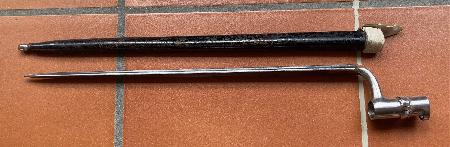 Französisches originales Stichbajonett mit Lederscheide, Modell 1822 Originales französisches Stichbajonett (Tüllenbajonett) in Lederscheide mit Metallknopf an der Spitze. Weisser Lederriemen am oberen Ende der Scheide mit Aufdruck: „B“ Stempel auf Scheide: P Stempel auf Klingenbogen: „B-C“ Klingenlänge: ca. 450 mm Klinge: 3-kantig/lame triangulaire Gesamtlänge/longueur totale : 515mm Durchmesser Mündungsring/diamètre de l’anneau de bouche: ca. 21 mm Seriennummer: 29 Altersbedingter Zustand gemäss Bilder/Métal poli dans une patine grise, avec taches de surface. Baïonnette à douille, modèle 1822. Cette baïonnette, règlementaire française du XIXᵉ siècle est une pièce historique remarquable, à conserver absolument pour tout collectionneur d’armes anciennes ou passionné de militaria. Poinçon de contrôle visible sur le talon de la lame.  Au XIXe siècle, la Suisse a utilisé ce type de baïonnette inspirée du modèle 1822 français, pour ses propres fusils à percussion. Privatverkauf: keine Garantie und keine Rücknahme. Twint auf Anfrage möglich. Zusätzliche Versandkosten: CHF 12.00