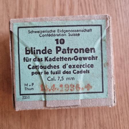 1 Originalschachtel CH-Armee (10 Schuss) Blinde Patronen für das Kadetten-Gewehr Kal. 7.5mm. Verschlossen. M+F Thun 1936 / OVP - gemäss Bild - Privatverkauf: keine Garantie und keine Rücknahme. Twint auf Anfrage möglich. Zuzüglich Versandkosten: CHF 9.00