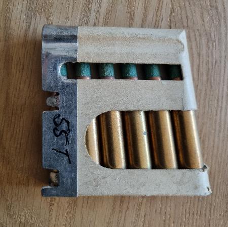 Lader 6 Blinde Patronen (Holzspitze) GP11 (7,5mm) Jg. 1955T / OVP - gemäss Bild - Privatverkauf: keine Garantie und keine Rücknahme. Twint auf Anfrage möglich. Zuzüglich Versandkosten: CHF 9.00
