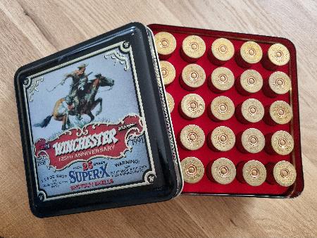 Sammler Jubiläums Winchester Mun. SUPER•X 12/70 / 25 Stk. in Jubi Blechdose / OVP - gemäss Bild - Privatverkauf: keine Garantie und keine Rücknahme. Twint auf Anfrage möglich. Zuzüglich Versandkosten: CHF 12.00 ***### Beachtet auch meine anderen Auktionen ###***