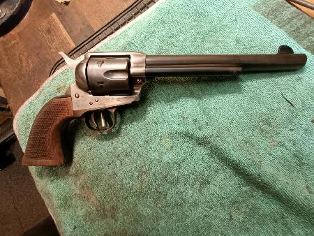 feuchte Lagerung hinterlassen Spuren. Total Revision eines Cattleman. neue Uberti Trommel (Finish dem alten Rahmen angepasst) ... neuer Griff (Uberti) ... neuwertiger Colt Lauf von 1961 ... Ausstosser & Gehäuse von Colt ... neue spezial Trommelachse (US Fertigung) ... neue Federn und Schrauben .... getestet mit Magtech 45 Colt 250 LFN ... neuwertige Waffe - top Shooter.